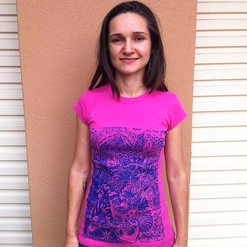Hand screen printed on recycled shirt. Cotton/Spandex.